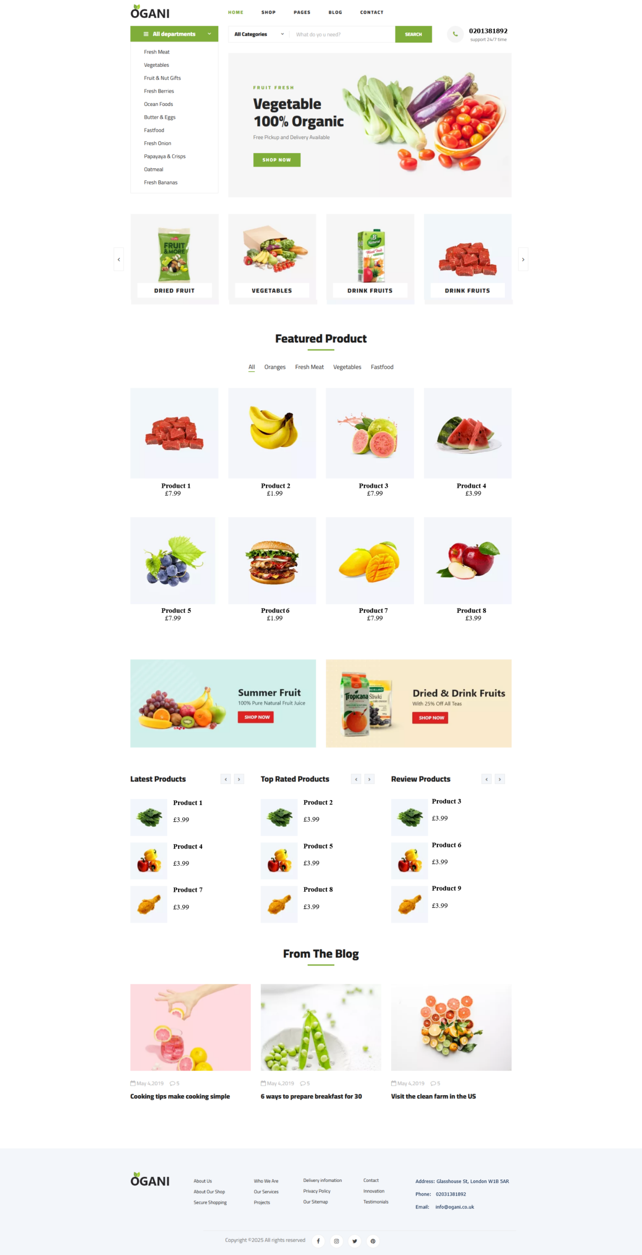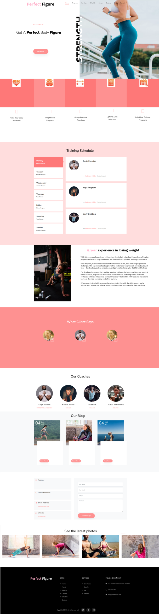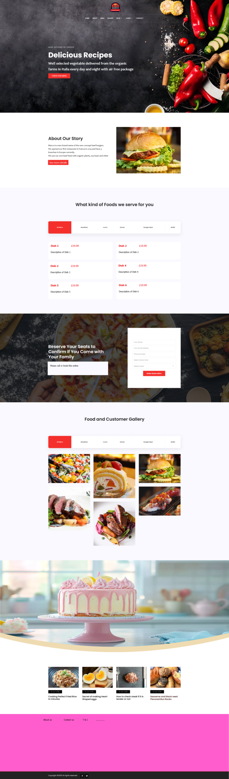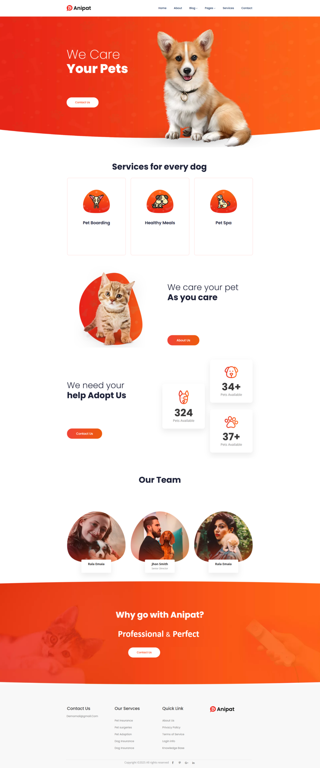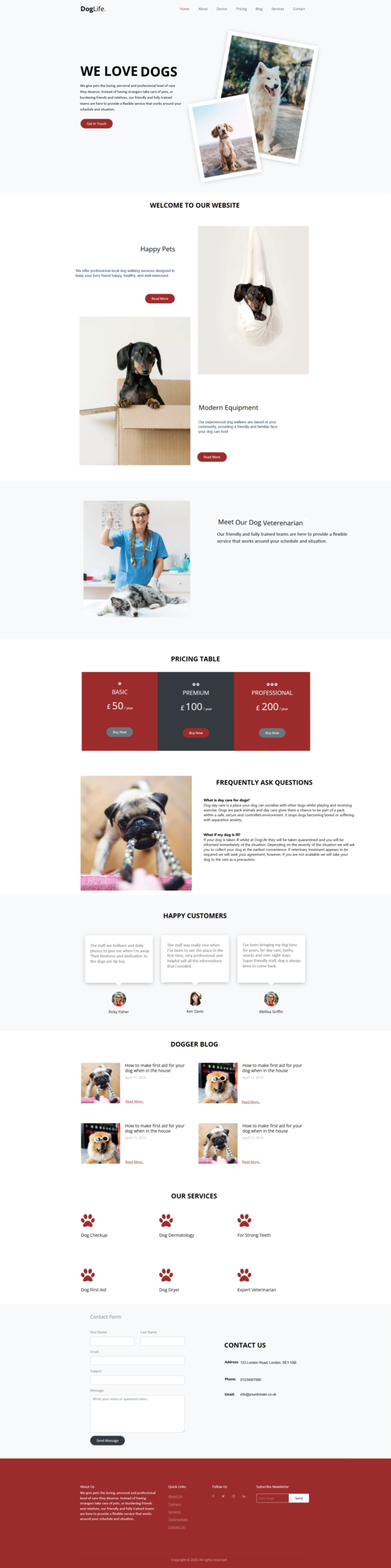 Footer: Bottom section with contact info, extra links, and copyright.