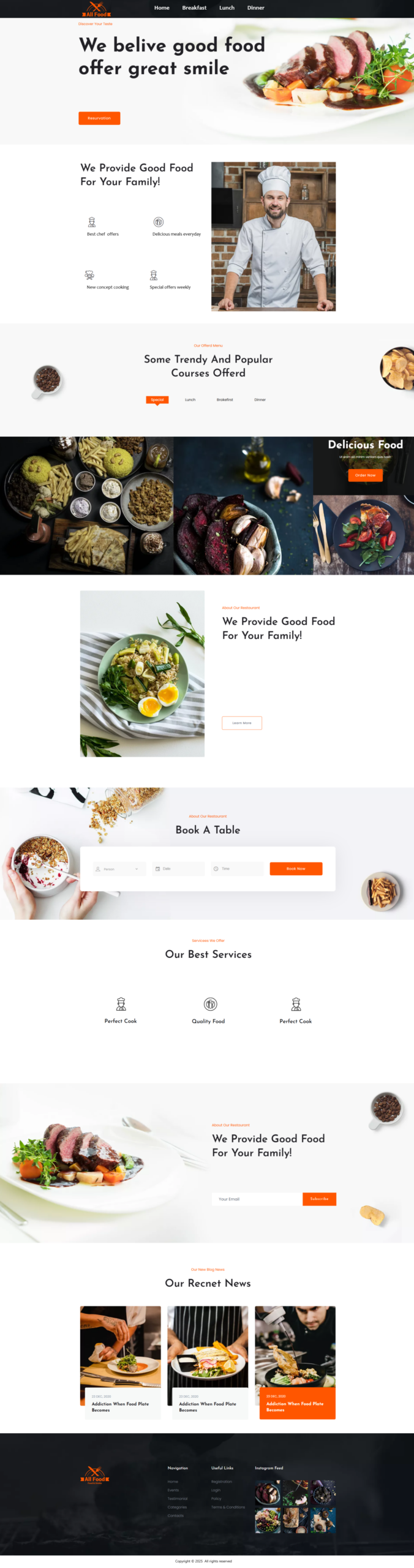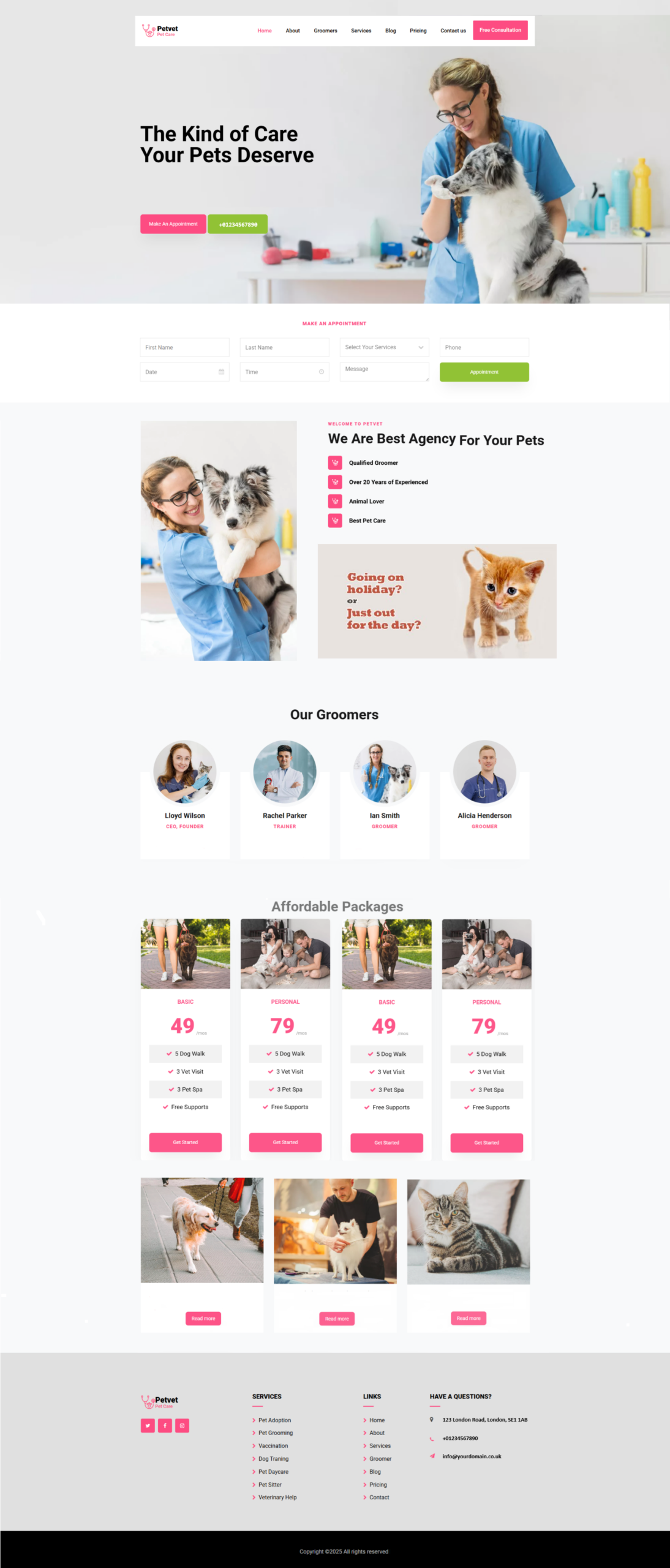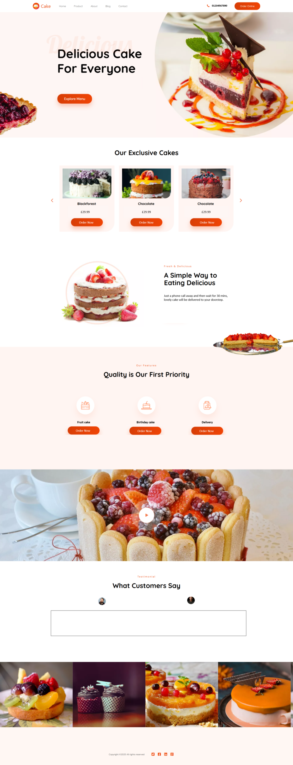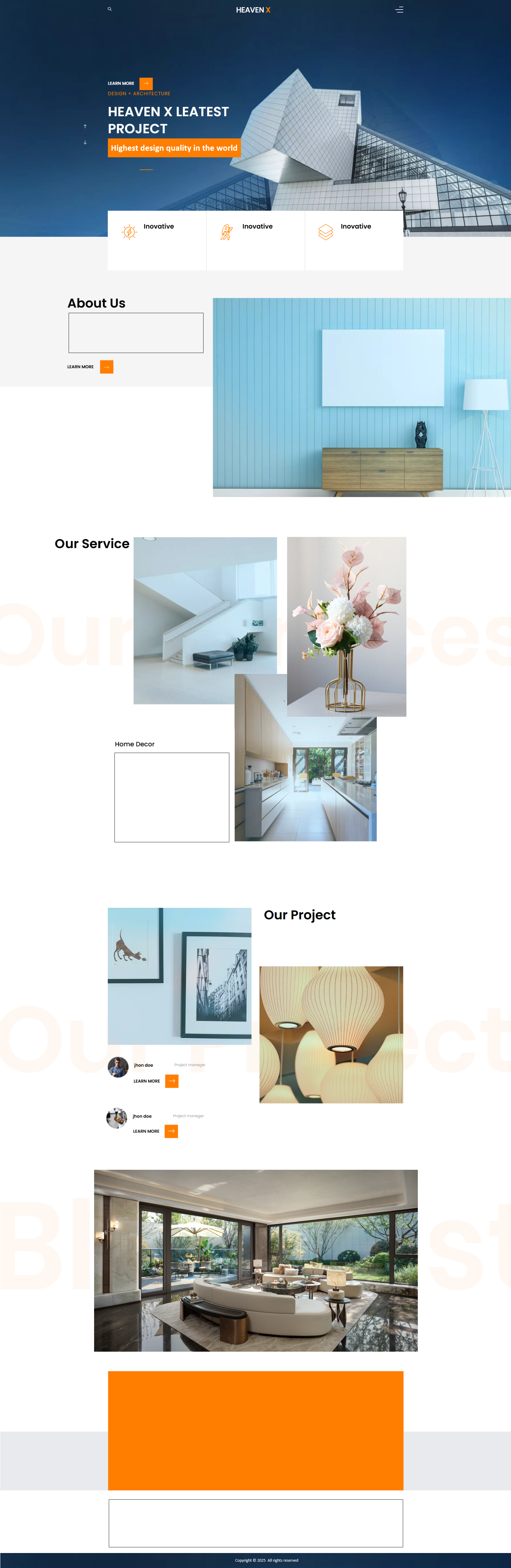 Footer: Bottom section with contact info, extra links, and copyright.
