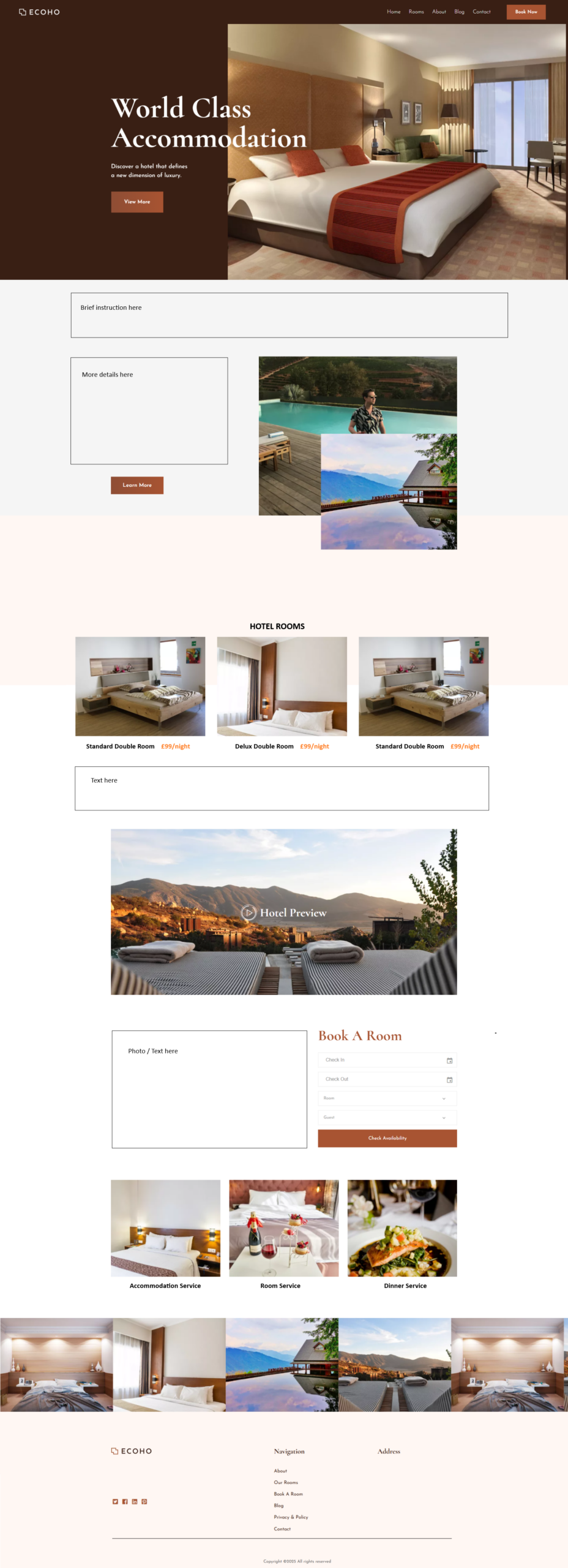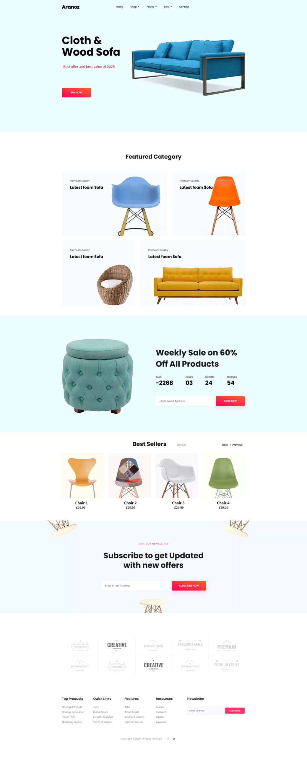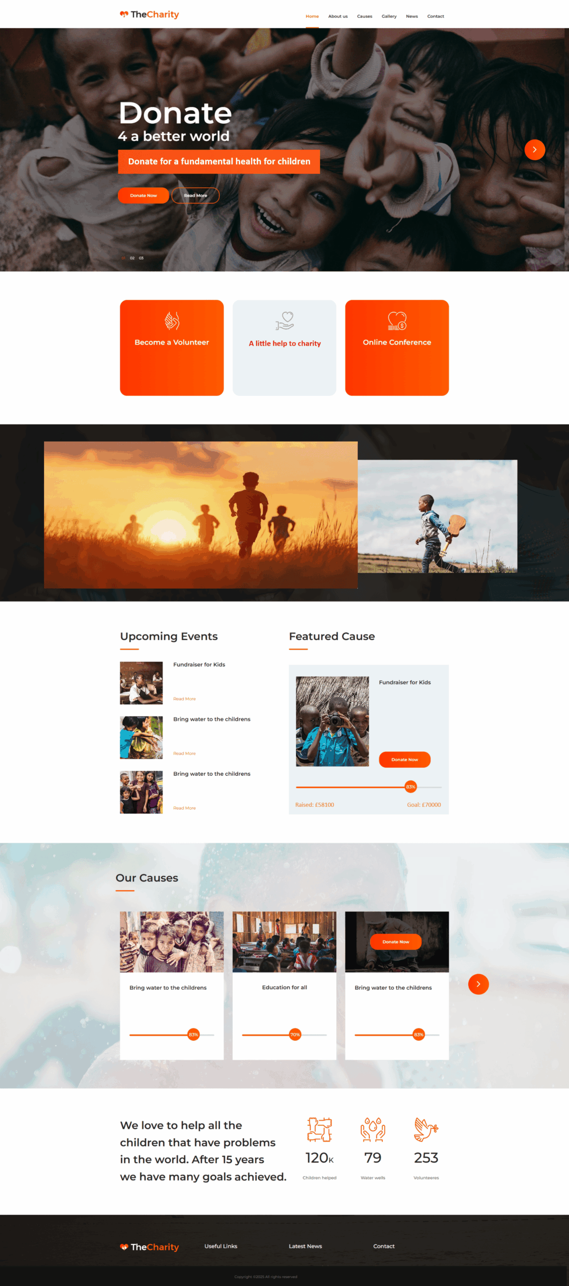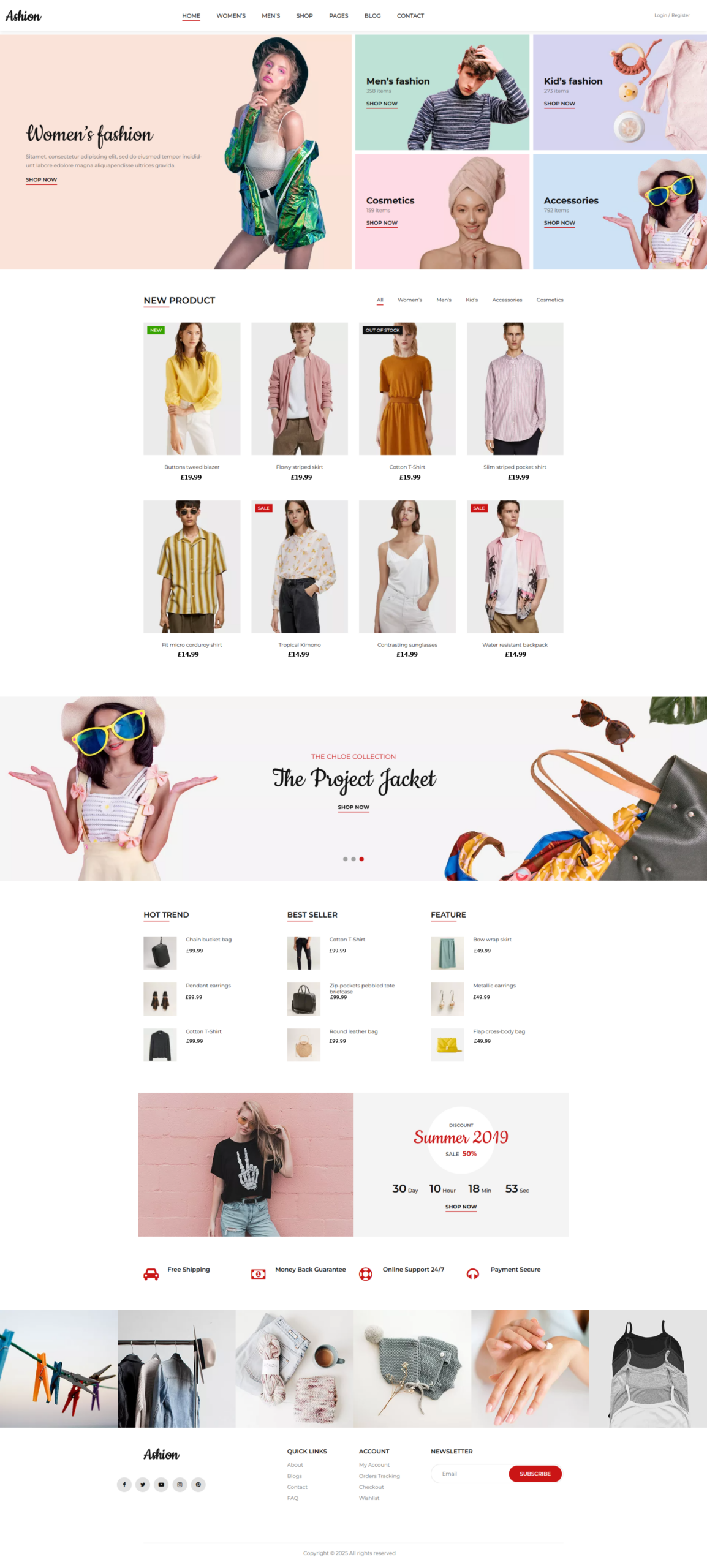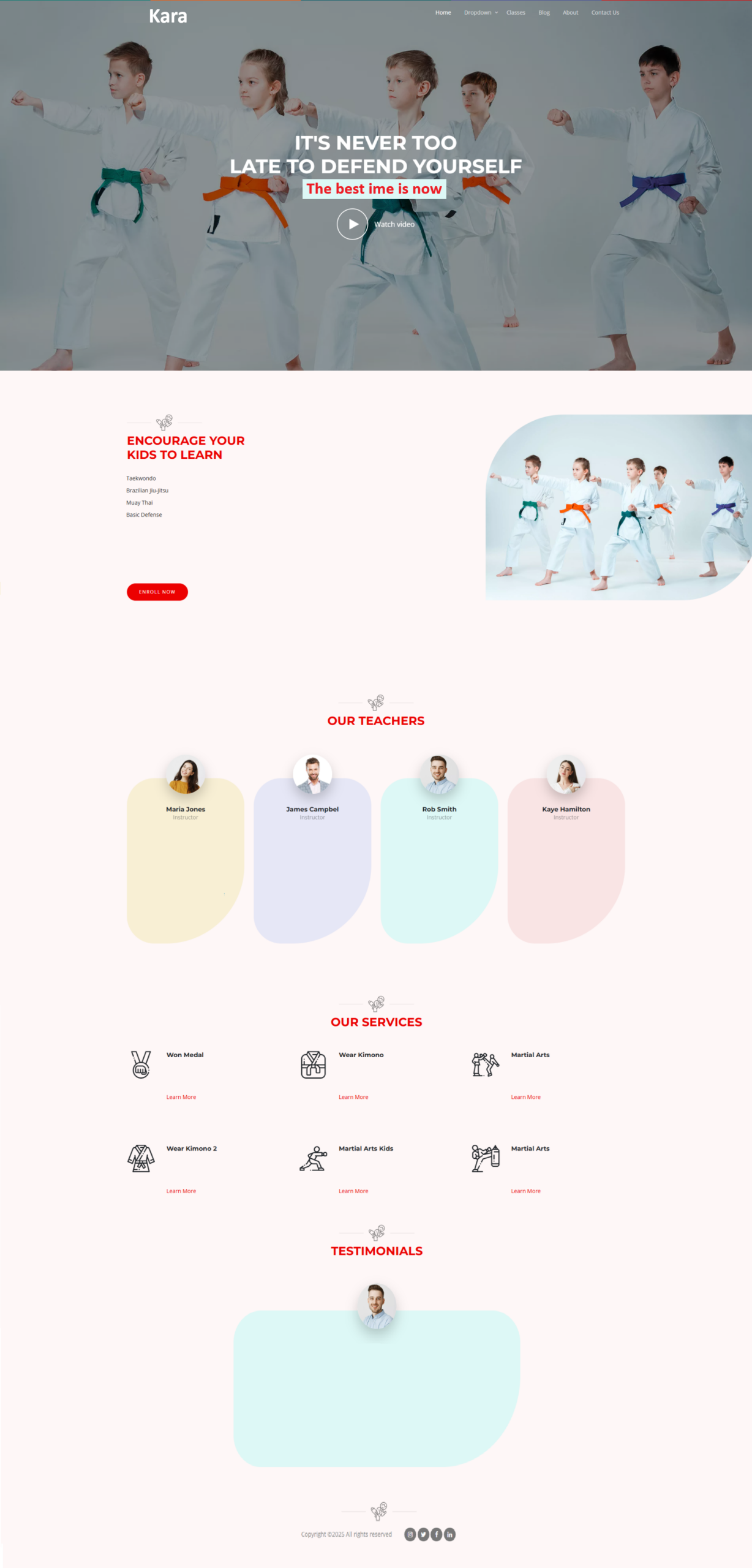 Footer: Bottom section with contact info, extra links, and copyright.